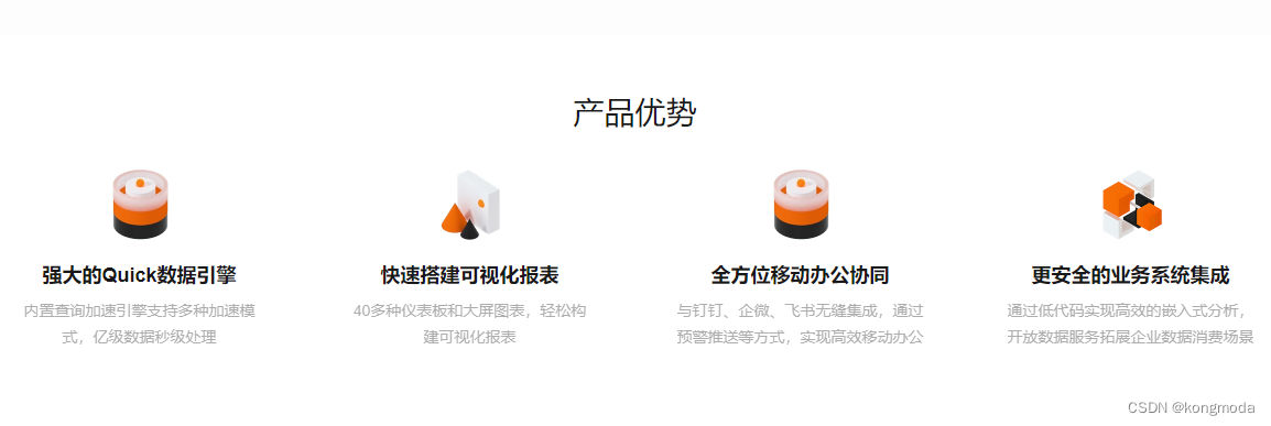 专业型:这类工具针对某一特定的行业或领域,提供定制化的可视化方案和模板,满足特定的业务场景和指标。例如,Quick BI是专为云上用户和企业量身打造的新一代自助式智能BI服务平台,能够无缝对接各类云上数据库和自建数据库,提供拖拽式操作和丰富的可视化效果,帮助用户轻松自如地完成数据分析、业务数据探查、报表制作等工作。Quick BI 还支持智能语音查询、自然语言处理、机器学习等人工智能技术,让用户可以通过语音或文字来提问数据,并得到智能回答和推荐。Quick BI 还提供了多种行业解决方案,例如电商、金融、教育、房地产等,让用户可以快速搭建适合自己行业特点的数据门户。