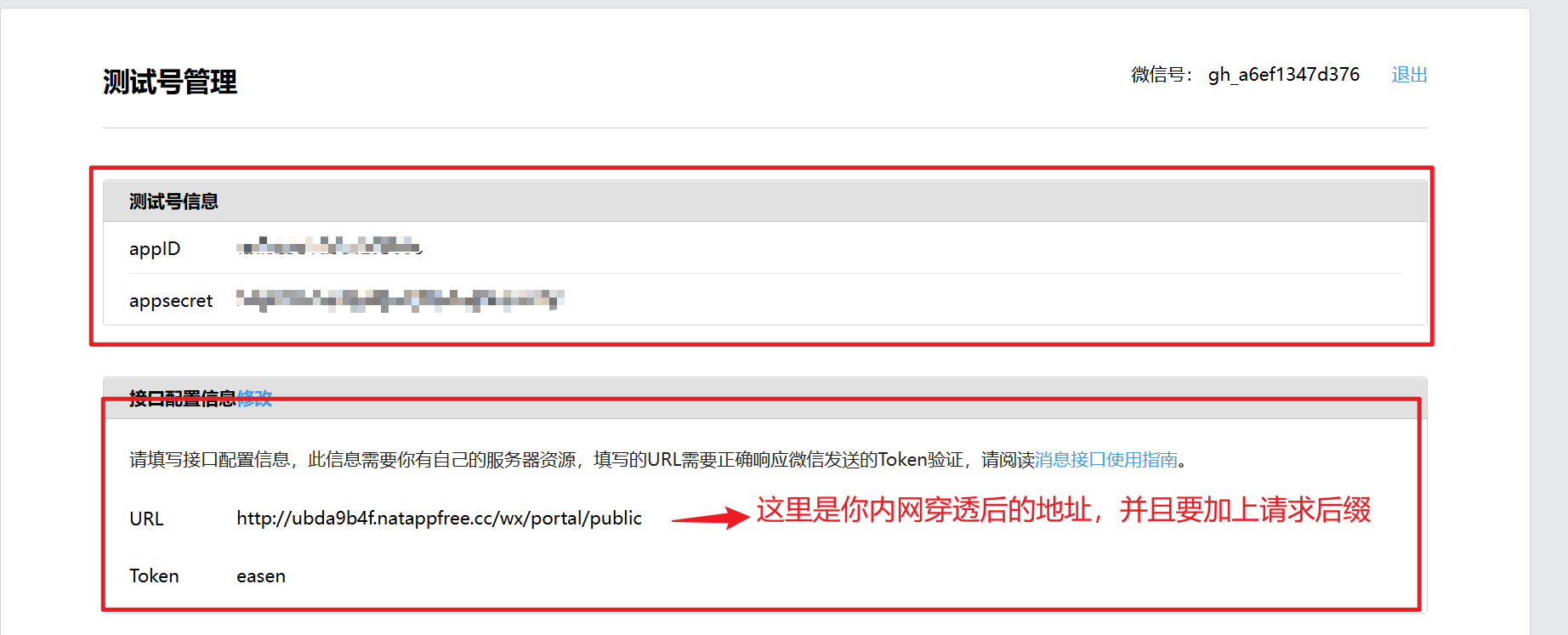 这里URL得内网地址加上 /wx/portal/public ,比如说你的内网地址是这样,URL就是http://t7987867.natappfree.cc http://t7987867.natappfree.cchttp://t7987867.natappfree.cc /wx/portal/public