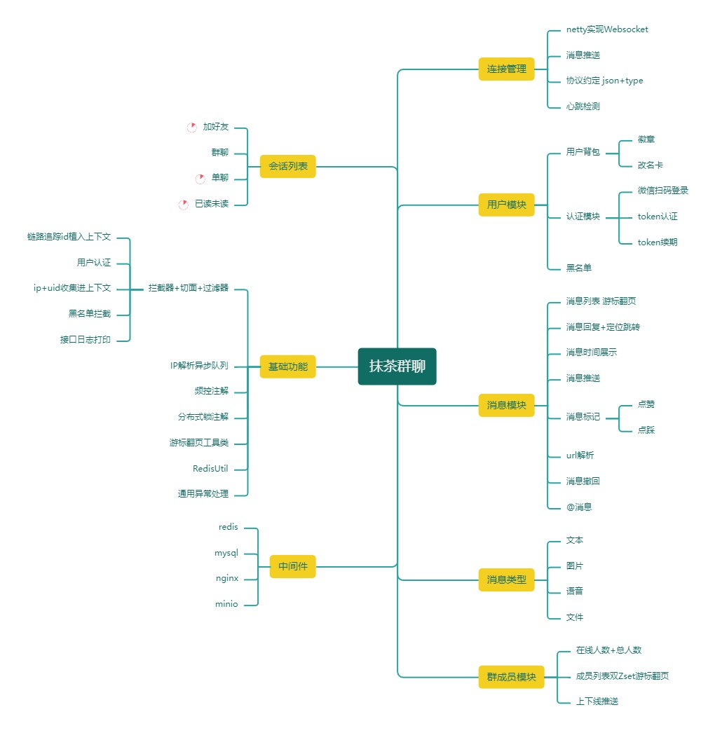 抹茶聊天是一个IM项目,通过netty实现和前端的websocket连接。内含微信扫描登录,成员列表,消息列表,消息互动,丰富的消息类型,还有很多实用的小轮子列如aop日志,分布式锁注解,频控注解,ip解析归属地等,持续更新中。。。