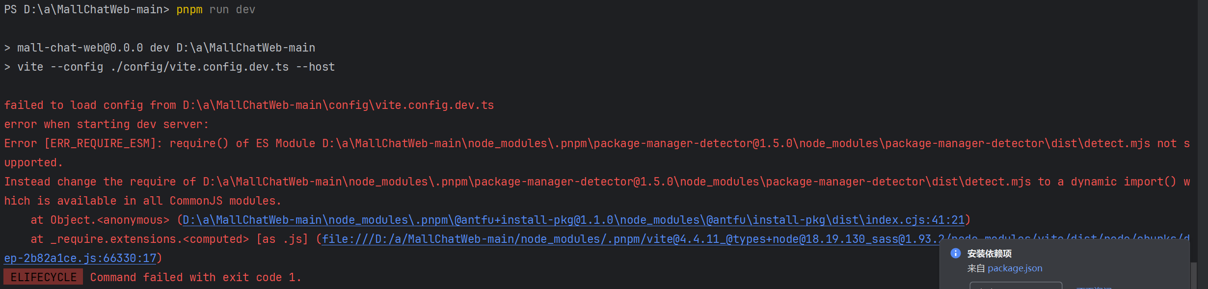 Error [ERR_REQUIRE_ESM]: require() of ES Module D:\a\MallChatWeb-main\node_modules\.pnpm\package-manager-detector@1.5.0\node_modules\package-manager-detector\dist\detect.mjs not supported.
