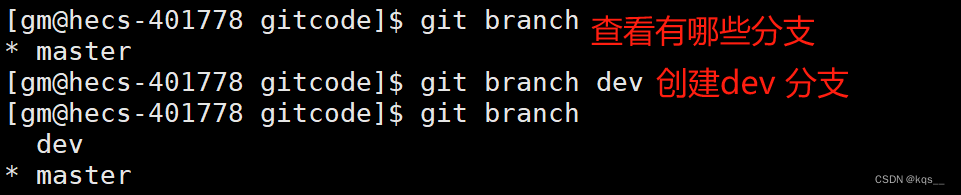 Git 支持我们查看或创建其他分支,在这里我们来创建一个自己的分支 dev ,对应的命令为: