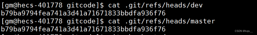 通过查看dev 和 master中的指向,我们可以看出来他们指向同一个提交。
