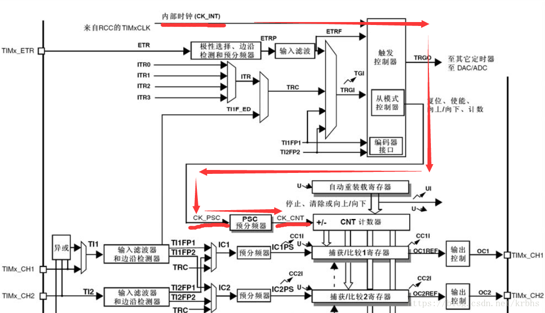4、内部触发输入(ITRx):使用一个定时器作为另一个定时器的预分频器,如可以配置一个定时器Timer1而作为另一个定时器Timer2的预分频器