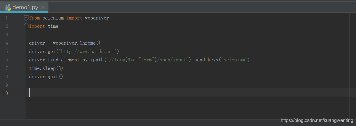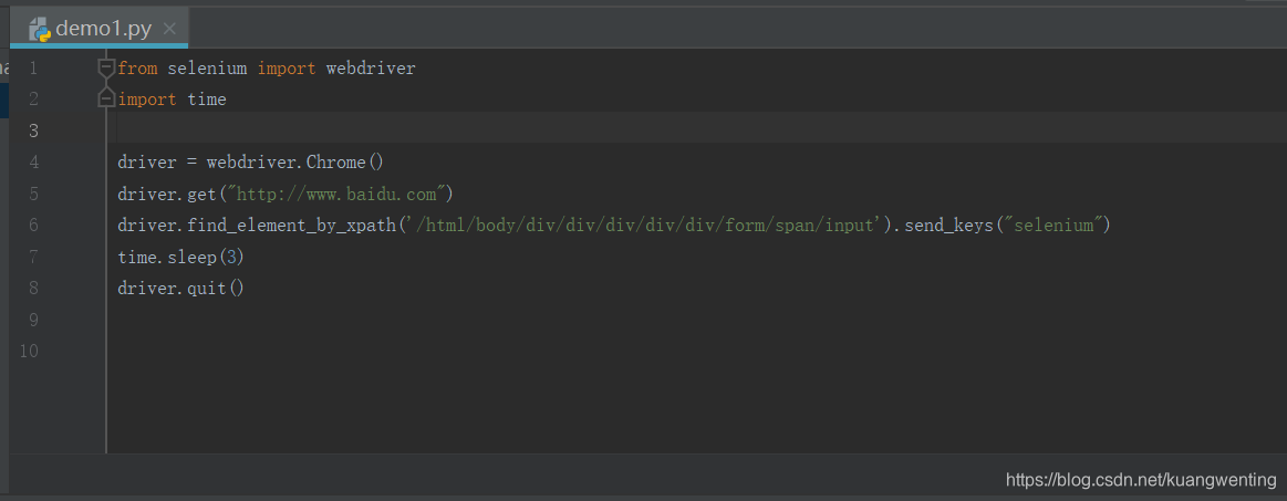 copy出来的xpath为//*[@id="kw"],在selenium+Python的脚本中,通过xpath方式进行元素定位的脚本实现如下图所示: