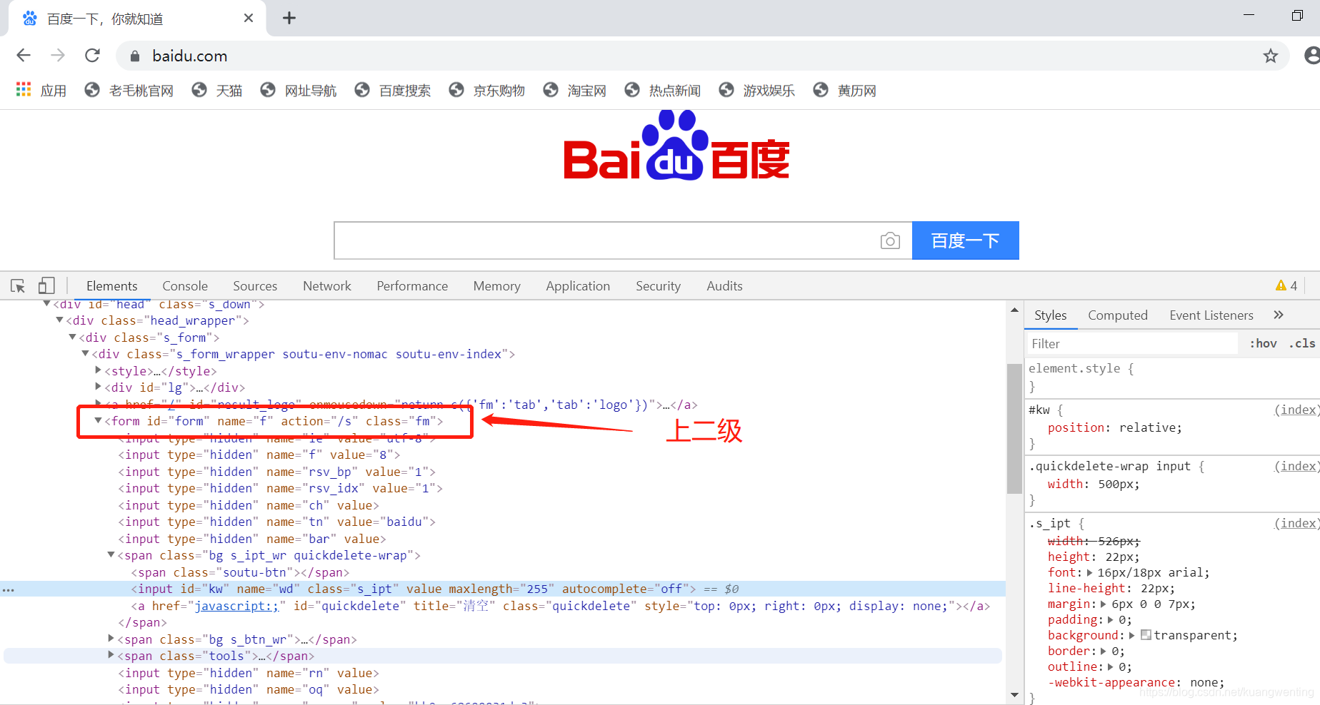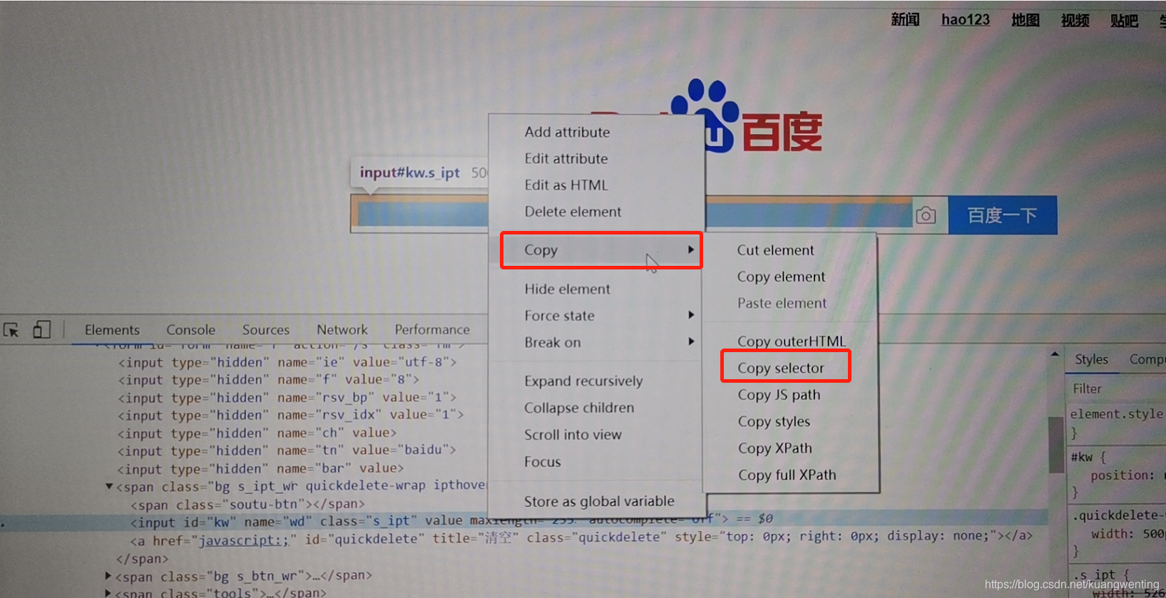 第二,通过css selector进行元素定位,同样以百度为例,如图所示: