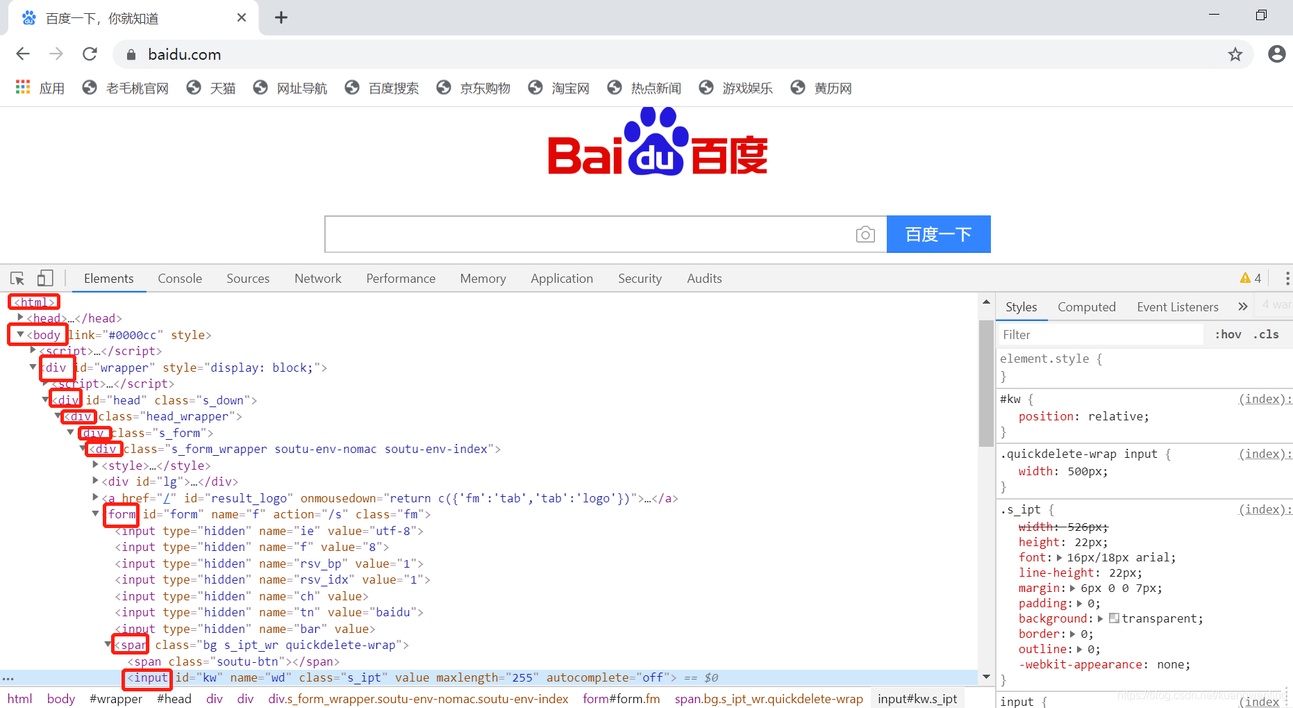 xpath的绝对路径,以百度为例,在浏览器上定位百度的输入框时,html的信息为一下,通过html进行逐层定位,如下图: