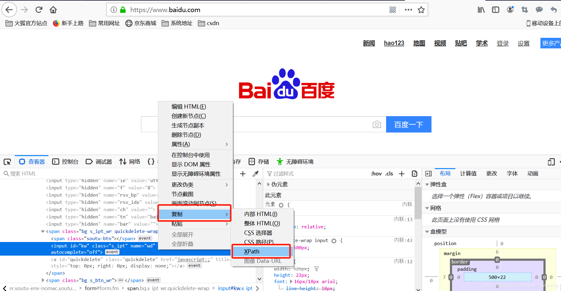 除了chrome浏览器可以copy xpath,firefox浏览器也可以复制,如下图,操作步骤和上面一样,本次不具体记录: