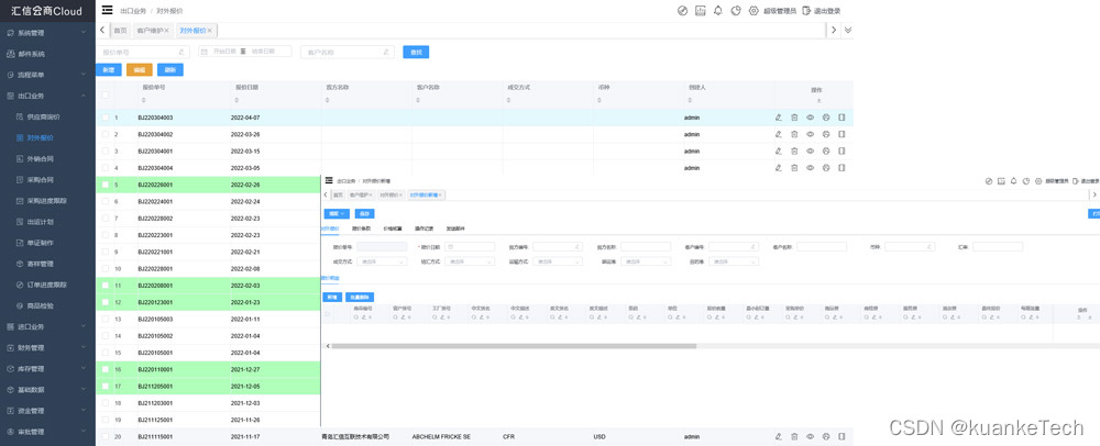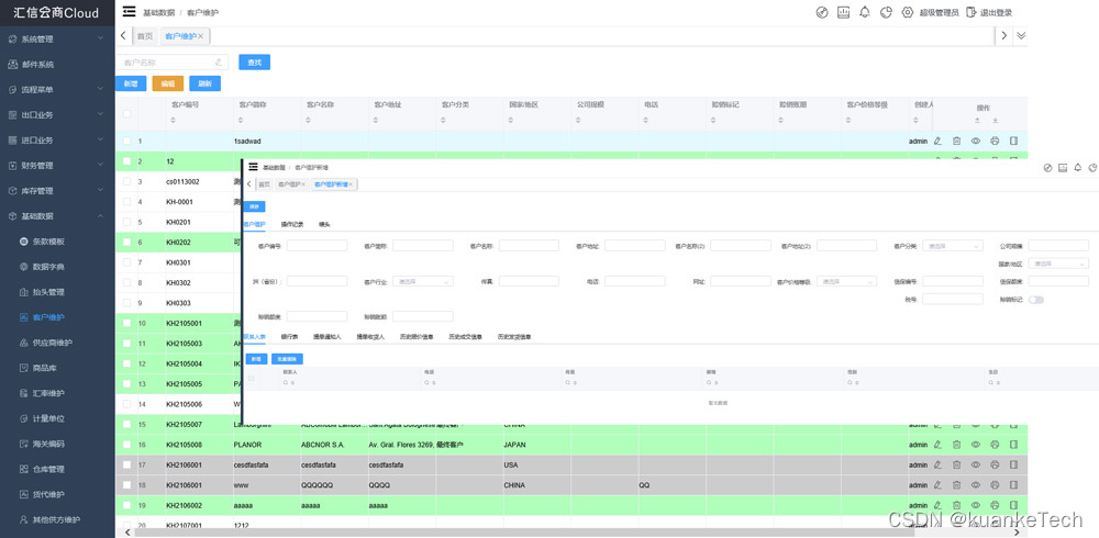 亮点三:客户管理。客户信息,经过确认以后不能随便修改,防止误改客户信息;客户分级,控制风险,设定好风险范围后,一旦超过设定的范围系统自动提醒,提示是否还要执行合同,帮助企业规避风险;单证可调用出货地址,选择客户时自动调取出货地址,减少重复录入工作;查看某个客户哪一年度的累计贸易量;列表方便查询以及观看客户审核状况,通过不同颜色区分状态;筛选功能,模糊查询方便查询客户或者供应商等信息;附件功能,可将客户名片等信息以附件形式录入系统;转出功能,针对业务员变动情况一键将账号下客户转出给另一个人去跟踪。