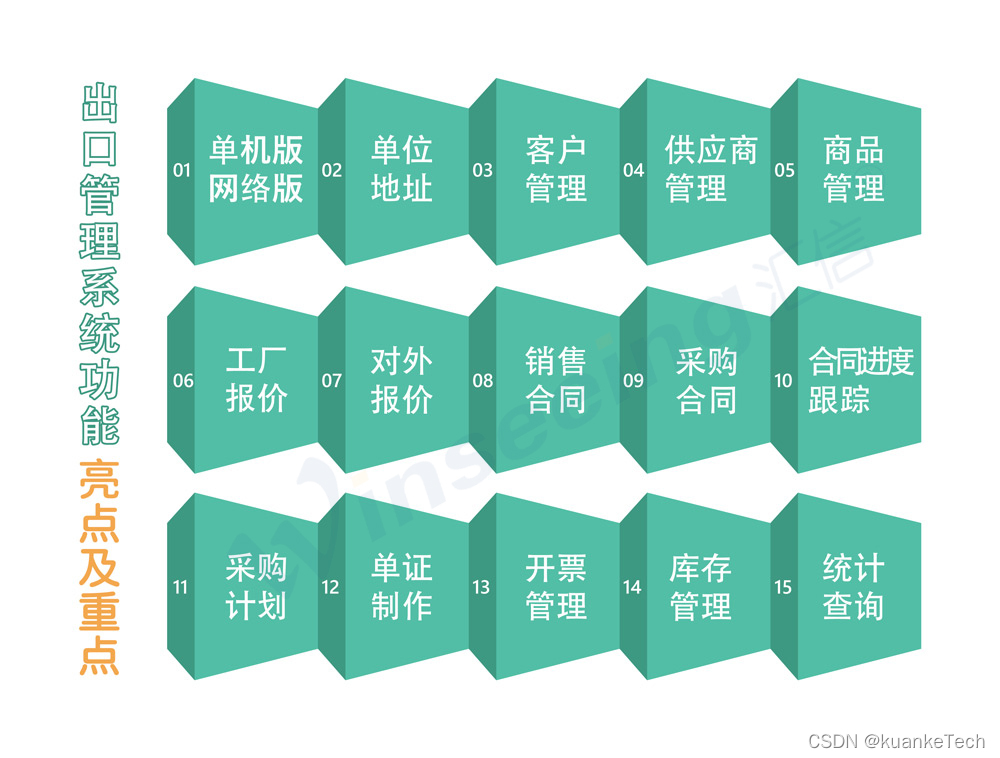 winseeing外贸出口管理软件系统通过全面的流程管理,如询价、报价、合同、采购、库存等,以及定制化的跟踪节点和风险控制,助力外贸企业提高效率,降低成本。系统特点包括单机/网络版、客户与供应商管理、商品分类、报价与合同管理、进度跟踪、采购计划、单证制作、开票管理、库存控制和统计查询,确保业务操作便捷且精准。