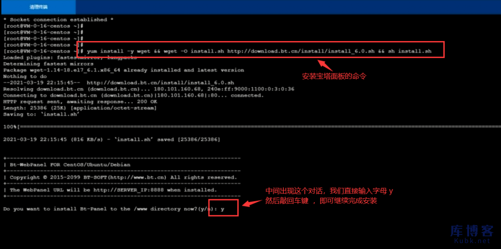 安装成功后,可以看到宝塔面板的登陆地址和用户名密码。