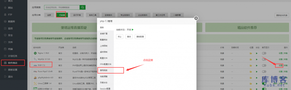 在“软件商店”里找到PHP,点击“设置”-“禁用函数”