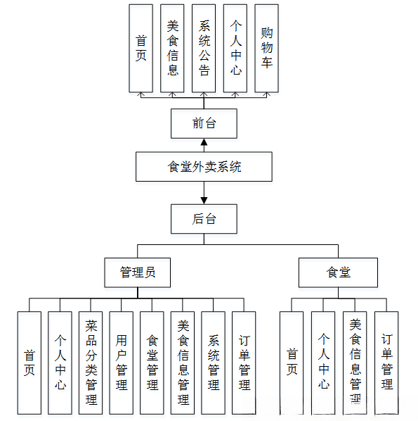 食堂外卖系统主要有三类用户。分别是管理员,用户,食堂,详细规划如图4-1所示。