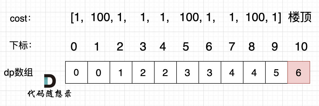 那么 dp[0] 应该是多少呢? 根据dp数组的定义,到达第0台阶所花费的最小体力为dp[0],那么有同学可能想,那dp[0] 应该是 cost[0],例如 cost = [1, 100, 1, 1, 1, 100, 1, 1, 100, 1] 的话,dp[0] 就是 cost[0] 应该是1。