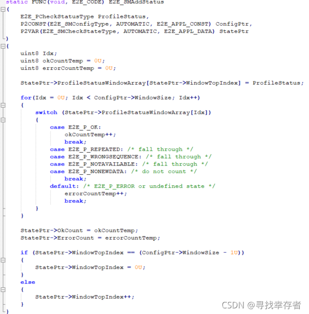 E2E_P01STATUS_OKSOMELOST: CRC 验证成功,但是Rolling Cnt不连续且在容忍范围内(<=MaxDeltaCounter)即丢(MaxDeltaCounter-1)帧数据可接受