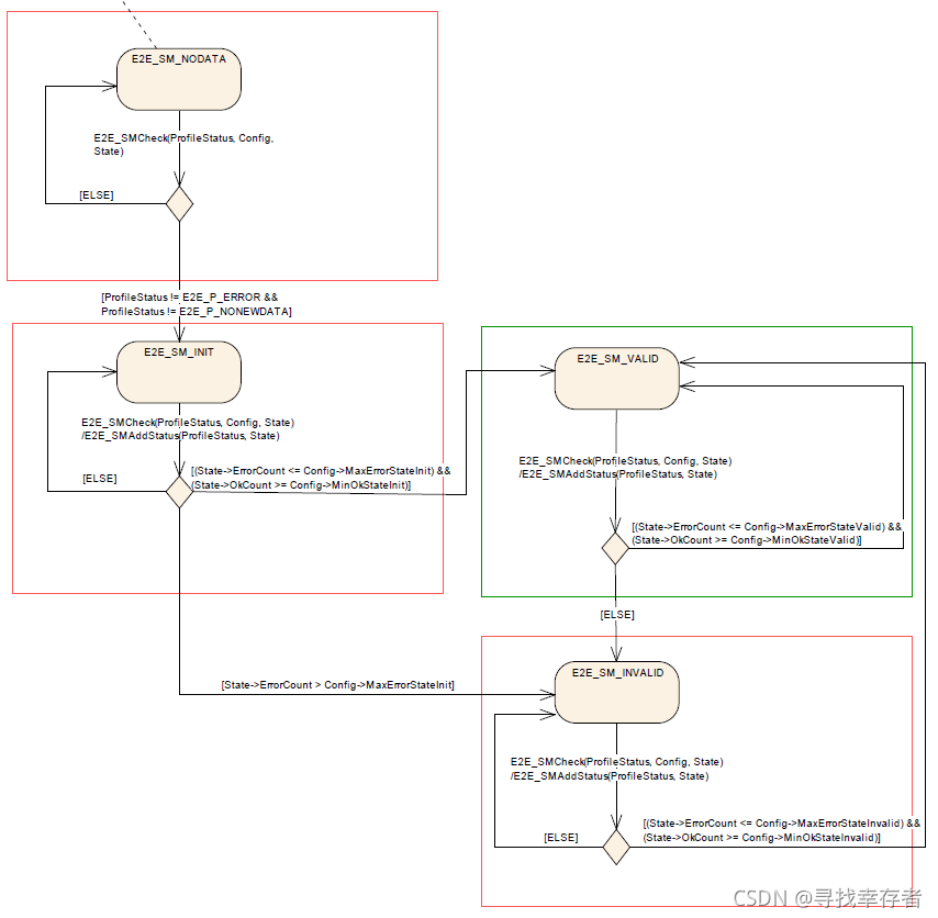 E2E_SM_INIT: 只要收到过1帧CRC验证成功的报文就会转换为此种状态,一般只的就是第一帧验证成功的E2E报文