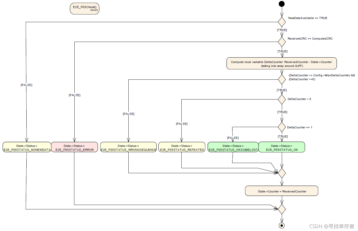 NOTE: 正常情况当我们收到一个E2E Frame ,只要对应的CRC校验通过后,那么收到的Rolling Cnt就会被采用,即下一帧期望收到的Rolling Cnt 为本次值+1, 但是如果SyncCounterInit >0 ,当收到的DeltaCounter > MaxDeltaCounter ,则并不会采用收到的Rolling Cnt, 意味一旦这种情况出现,需要等待Rolling Counter“扣圈” 发生,即当再次DeltaCounter < MaxDeltaCounter满足时,才会进行“重同步”