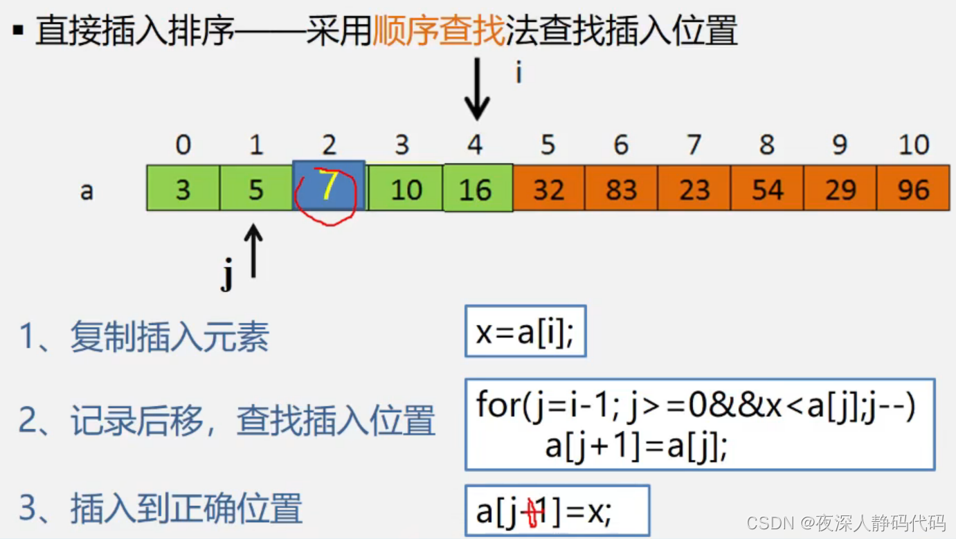 1、直接插入排序的过程:顺序查找法查找插入位置