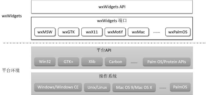 wxWidgets采用分层结构,自下而上分为操作系统层、平台API层、端口适配层、wxWidgets API层。