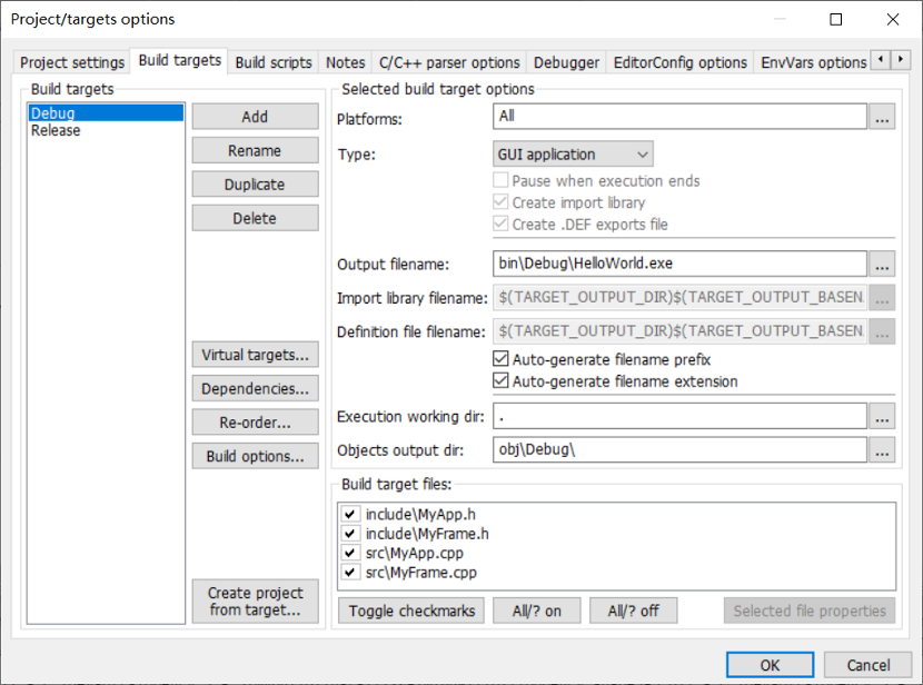 在Linker Setting中添加wxWidgets的lib库文件。