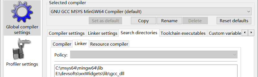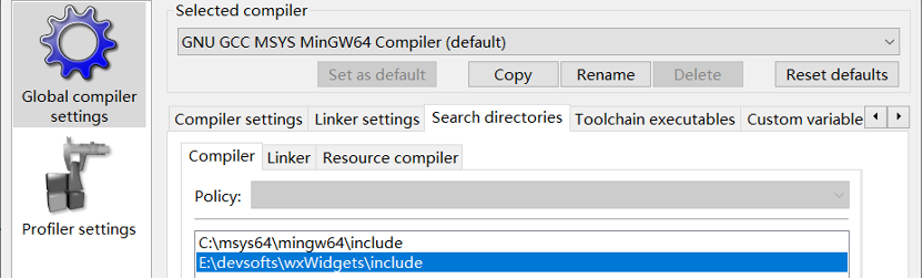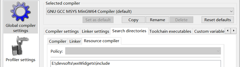 尽管CodeBlocks是基于wxWidgets开发,但在发布版的程序中不带wxWidgets开发包。需要设置wxWidgets的include目录和lib目录。菜单“Setting->Compiler...”,在Global Setting的Search Directory中,分别添加Compiler、Linker和Resource Compiler的头文件目录。