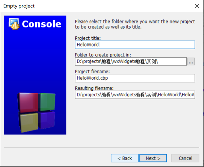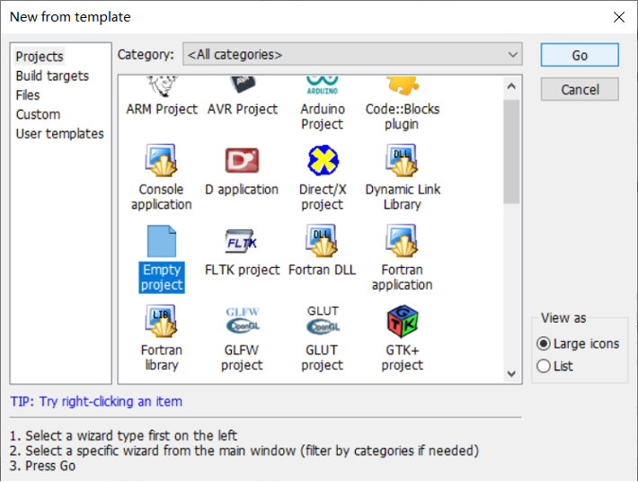 下面将演示如何使用CodeBlocks创建和运行该实例。和其它IDE一样,首先创建工程,通过菜单File->New->Project,弹出工程模板界面,可以有两种选择,一是Empty Project,二是wxWidgets Project。本教程采用第一种方式创建示例工程。两种方式在功能是等价的,没有优劣之分。