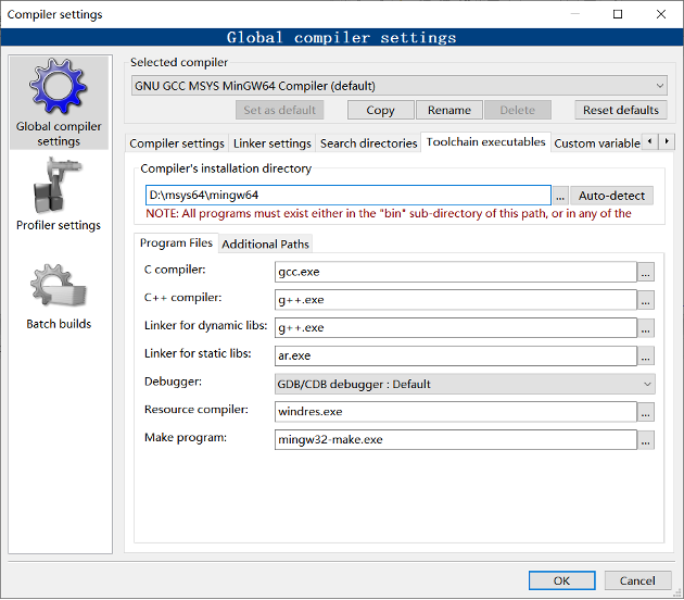 打开CodeBlocks。选择菜单“Settings->Compiler...”,弹出编译器设置对话框,在“GlobalCompiler Settings”中配置“Toolchains executable”为MinGW-64中的相关工具,具体配置如下。