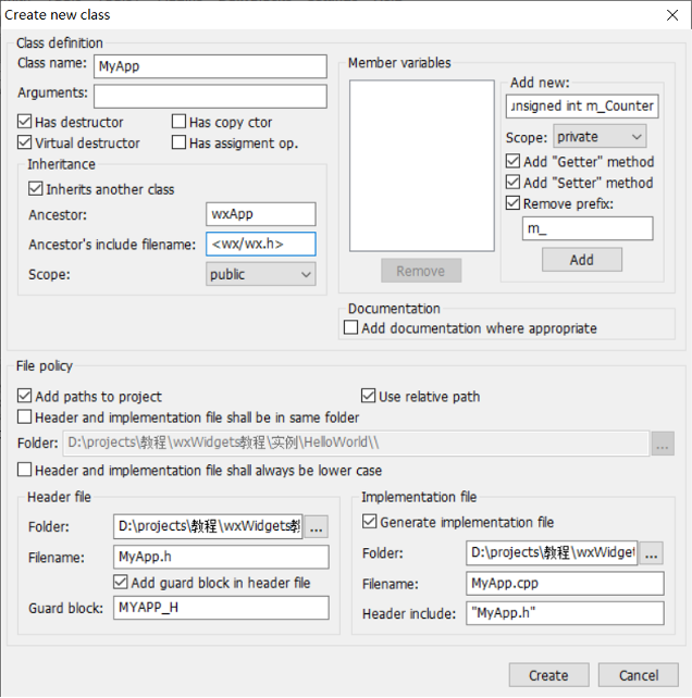 菜单“File->New->Class”新建MyApp类,继承至wxApp。