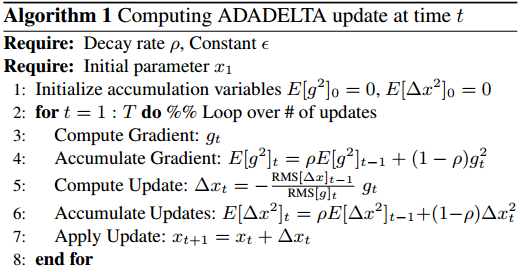 其中E[g2]tE[g2]t存储的是历史梯度平方的平滑值,此外,这里还需要对历史的参数值的平方进行decaying average,也就是E[Δx2]t=ρE[Δx2]t−1+(1−ρ)Δx2tE[Δx2]t=ρE[Δx2]t−1+(1−ρ)Δxt2,然后分别进行开方处理得到RMS[Δx]t=√E[Δx2]t+ϵRMS[Δx]t=E[Δx2]t+ϵ和RMS[g]t=√E[g2]t+ϵRMS[g]t=E[g2]t+ϵ。最后按照xt