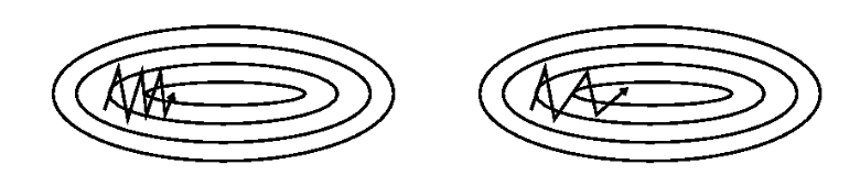 针对以上提到的第四点问题,可以通过增加动量(Momentum)的SGD进行缓解,加速优化函数的收敛。vt=γvt−1−η⋅∇θJ(θ)θ=θ+vt(2)(2)vt=γvt−1−η⋅∇θJ(θ)θ=θ+vt所谓的添加动量项,即在一定程度上保留上一次梯度更新的方向,γ,ηγ,η分别用来控制上次梯度方向和本次梯度方向对最终更新方向的贡献程度,其中γ∈(0,1]γ∈(0,1]在开始阶段常常被设置为0.5,当学习趋向稳定后,逐渐增加到0.9甚至更高。 可以把待优化的目标函数想象成一座山,在山顶将一个小球推下,小球在山坡上滚动的位置即系统的loss值,在往下滚动的过程中小球的动量不断增加,由于动量的存在,当小球滚动到山坡中较为平坦的地带时,小球将更容易越过这片地带继续往下滚而不是陷在这一区域停滞不前,并最终到达山谷。