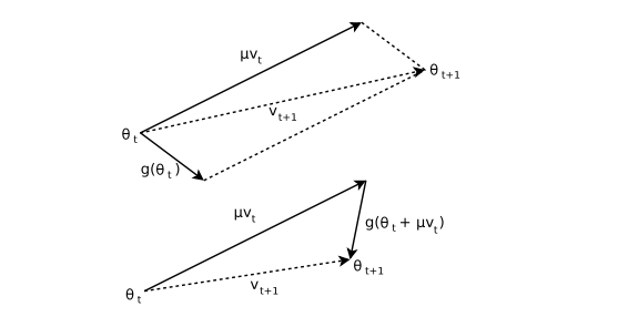 目前我们有了一个带有动量的小球,但是这个小球在滚动的过程中总是随着山势的变化滚动,因此其行进的路径极不稳定。因此我们希望有一个更加“聪明”的小球,它不但拥有动量,而且能够知道自己将要去哪,这样当前面出现上坡小球能够进行减速。比如说,当接近坡底时,小球应该提前减速避免错过坡底。vt=γvt−1−η∇θJ(θ+γvt−1)θ=θ+vt(3)(3)vt=γvt−1−η∇θJ(θ+γvt−1)θ=θ+vt具体的实现也非常的直接,就是将传统的Momentum方法对θθ计算梯度变为对θ+γvt−1θ+γvt−1求梯度,这一项可以看做对小球下一步将会往哪运动的一个粗略估计。也就是说,我们的小球有了一定的对未来的“预测”能力。就像本节开头说的,如果我们知道了小球之后会犯什么错误,那么是否更容易更正错误呢?下图上半部分是传统Momentum求下一次梯度更新方向,下半部分则是使用NAG求下一次更新方向的方法。