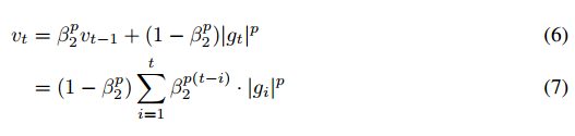 在 Adam 中,单个权重的更新规则是将其梯度与当前和过去梯度的 L^2 范数(标量)成反比例缩放。而我们可以将基于 L^2 范数的更新规则泛化到基于 L^p 范数的更新规则中。虽然这样的变体会因为 p 的值较大而在数值上变得不稳定,但是在特例中,我们令 p → ∞会得出一个极其稳定和简单的算法(见算法 2)。现在我们将推导这个算法,在使用 L^p 范数情况下,时间 t 下的步长和 vt^(1/p) 成反比例变化。