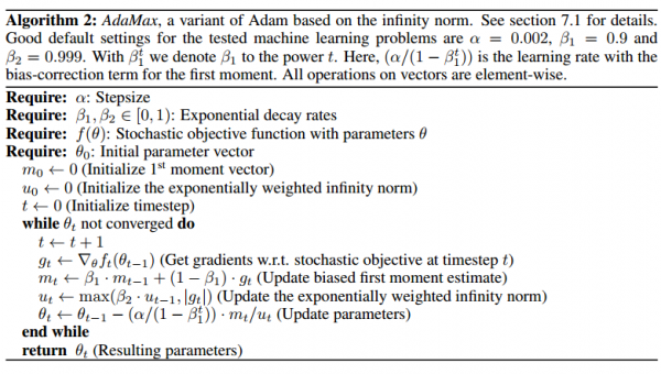 其中初始值 u0 = 0。注意这里十分便利,在该情况下我们不需要修正初始化偏差。同样 AdaMax 参数更新的量级要比 Adam 更简单,即|∆t| ≤ α。