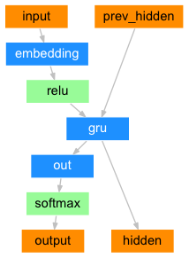 Remember that the input sentences were heavily filtered. For this small dataset we can use relatively small networks of 256 hidden nodes and a single GRU layer. After about 40 minutes on a MacBook CPU we’ll get some reasonable results.