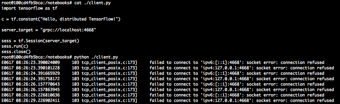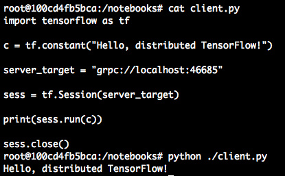 我们看到constant的字符串已经正常输出,有人发现这与单机版的TensorFlow例子很像,实际上Session的参数不同,并且这个op是在local server进程中执行并返回的,如果使用错误端口就会报RPC请求连接错误。