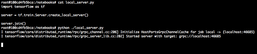 注意这里server和client启动在同一个进程了,为什么这么说呢?我们都了解TensorFlow客户端可以用Python或C++编写,本质上就是构建一个可执行的Graph,而Graph需要在Session中执行,因此代码中只要包含Session()的就是客户端,这时通过server.target选择本地刚创建的server来执行op。大家可能会好奇server.target是什么,我们在终端可以输出是'grpc://localhost:38612',一个字符串表示服务端的ip和端口,同时也确认它的协议是Google开源的gRPC。