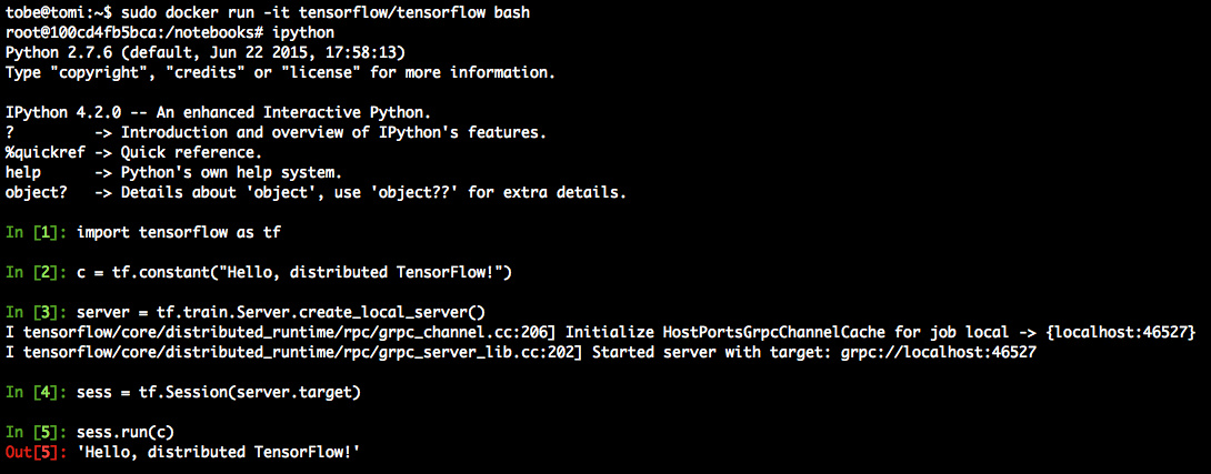 如果你愿意搭建环境测试,只要一行命令即可docker run -it tobegit3hub/ml-dev bash,其中ml-dev是我开发的机器学习镜像包含大量工具库,当然你也可以使用官方的tensorflow/tensorflow镜像。