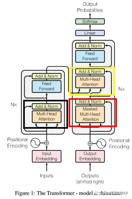 这个是《Attentionis all you need》里头的model图,首先可以看到一共有左右两个块组成,左边由input做输入的这一块称为encoder,右边由outputs做输入的这一块称之为decoder。