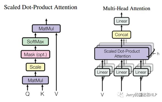 对于self-attention来讲,Q(Query), K(Key), V(Value)三个矩阵均来自同一输入,首先我们要计算Q与K之间的点乘,然后为了防止其结果过大,会除以一个尺度标度 ,其中 为一个query和key向量的维度。再利用Softmax操作将其结果归一化为概率分布,然后再乘以矩阵V就得到权重求和的表示