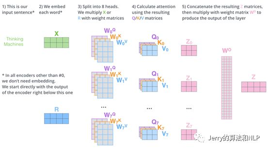 可以看出,所谓Multi-Head,就是只多做几次同样的事情,同时参数不共享,然后把结果拼接起来,进行线性变换然后做一个输出。(目的是为了能够多次捕捉到信息,也就是利用到多次attention机制中将不用类型捕捉到的信息进行结合)那这些信息存放在哪里呢?放在各自训练通道里的W矩阵中,最后形成八个小Z经过连接层连接后经过线性转换形成一个大Z
