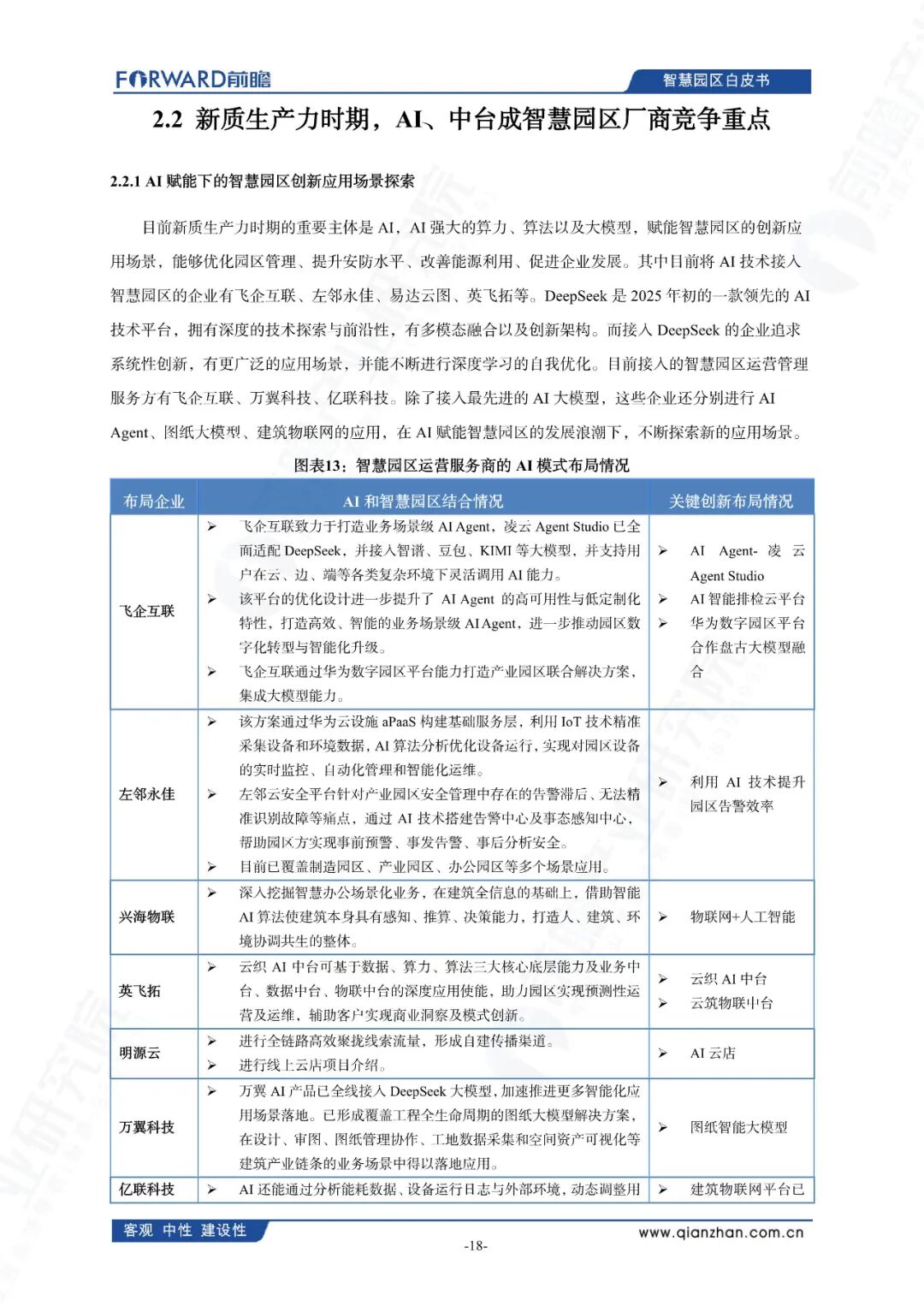 在竞争态势方面,智慧园区产业链条长、参与者众多,涵盖基础设施服务商、应用中台提供商、运营管理服务商等多类企业。当前竞争焦点集中在AI技术与中台系统的融合应用上,飞企互联、左邻永佳、万翼科技等企业在AI Agent、数字孪生、图纸大模型等领域表现突出。白皮书还发布了2024年智慧园区运营管理服务商TOP15榜单,飞企互联凭借其全面的业务布局、技术积累与生态合作优势蝉联榜首。