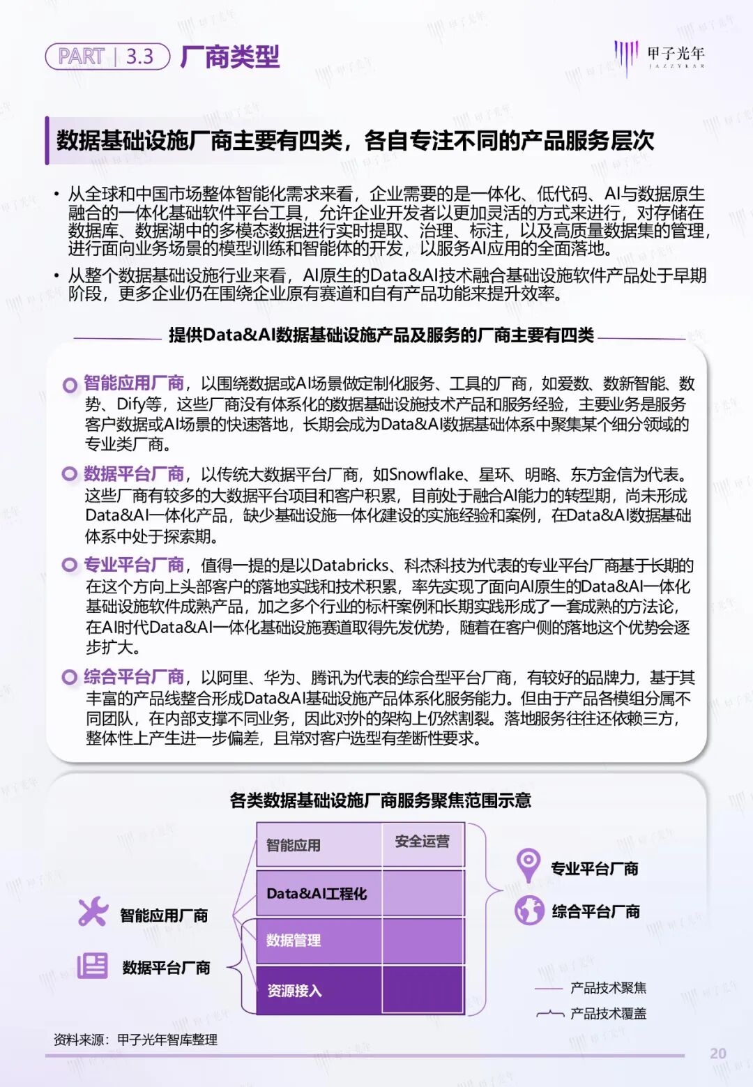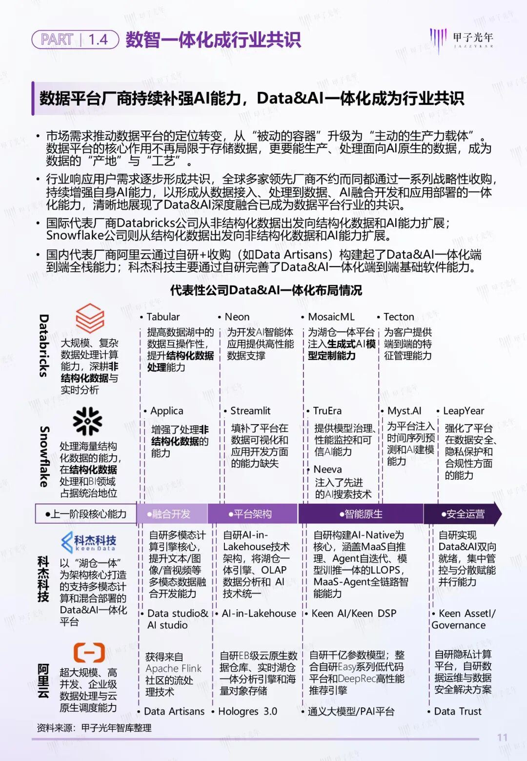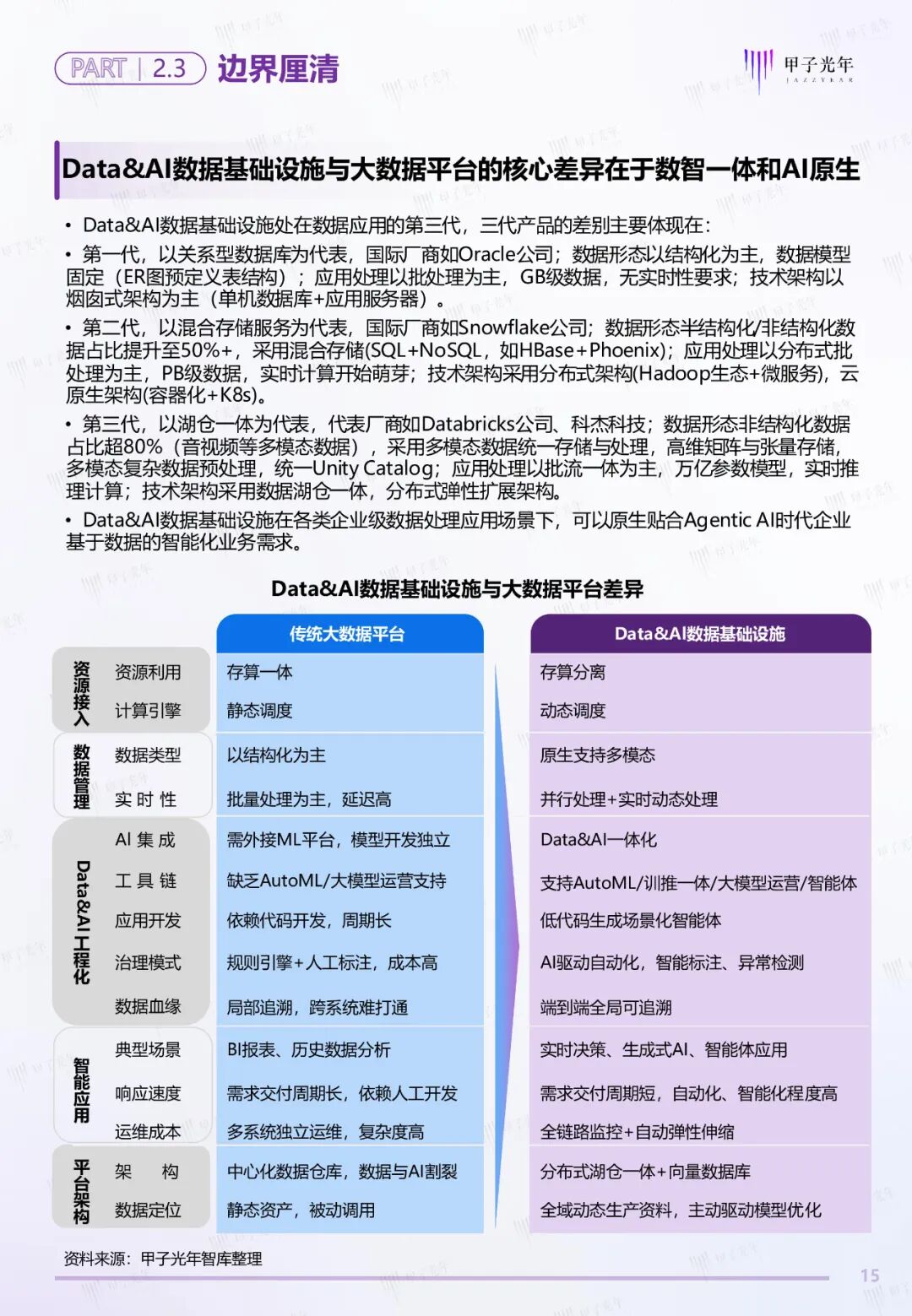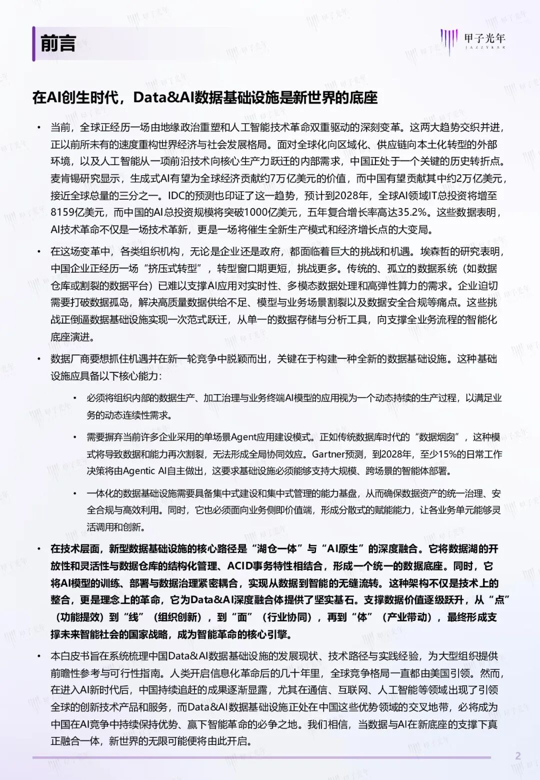 AI创生时代,数据基础设施已经成为支撑大型组织智能化变革的“核心生产工具”,新型数据基础设施的关键就是“湖仓一体”与“AI原生”的深度融合。为探索研究Data&AI一体化的最新趋势,甲子光年智库特开展本次研究工作,希望系统梳理中国Data&AI数据基础设施的新趋势、新定义、新范式与新实践应用案例,为大型组织部署Data&AI数据基础设施提供前瞻性参考与可行性指南。