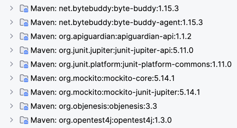 | 1 2 3 4 5 6 | <dependency> <groupId>org.mockito</groupId> <artifactId>mockito-junit-jupiter</artifactId> <version>5.14.1</version> <scope>test</scope> </dependency> |