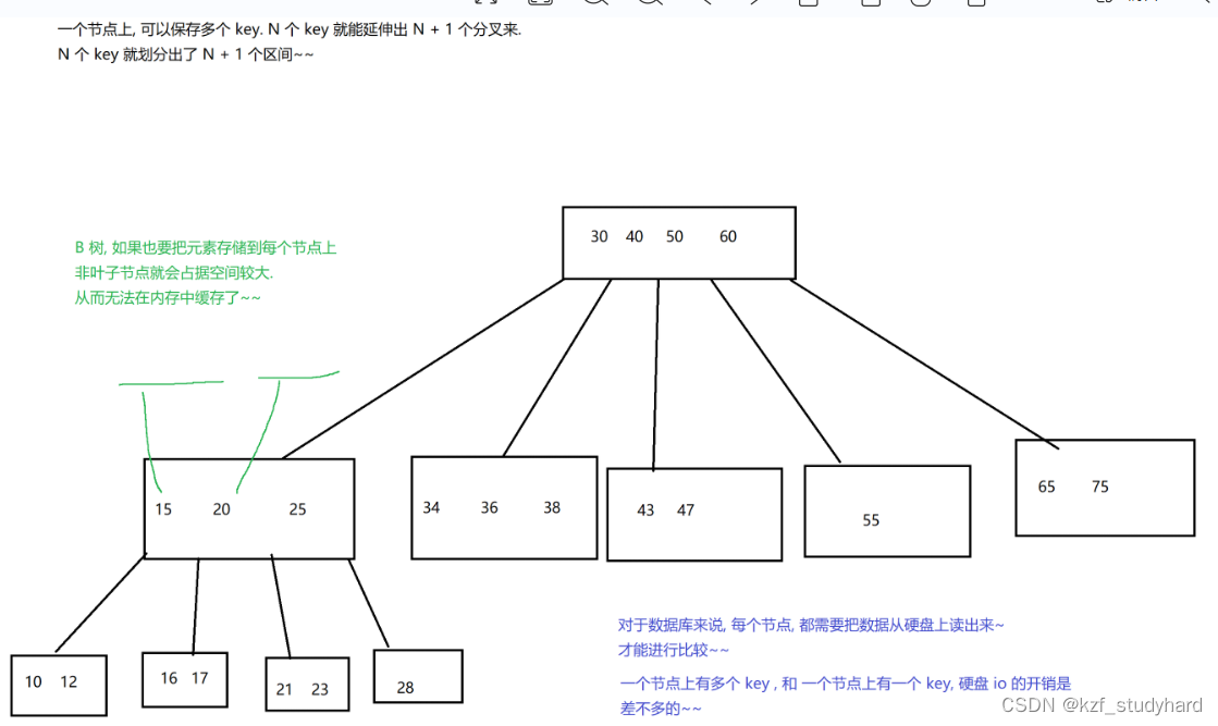 B+树也是 N 叉搜索树,但是 N 个 key 分出了 N 个区间.其中节点上的最后一个 key 就是最大值了(取最小值也行)。