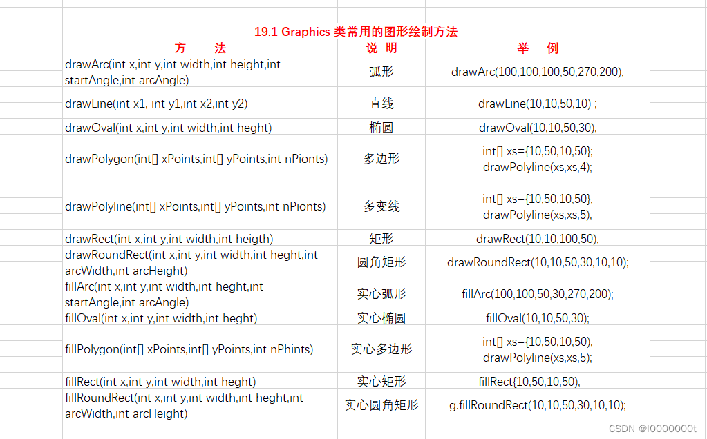 Graphics 类提供了绘图常用的方法,利用这些方法可以实现直线、钜形、多边形、椭面、圆弧等形状和文本、图片的绘制操作。另外,在执行这些操作之前,还可以使用相应的方法设置给图的颜色和字体等状态属性。