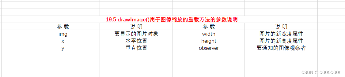 此方法总是用非缩放的图像来呈现缩放的矩形,并动态地执行所需的缩放。此操作不使用缓存的缩放图像。执行图像从源到目标的缩放,要将源矩形的第一个坐标映射到目标矩形的第一个坐标,源矩形的第二个坐标映射到目标矩形的第二个坐标,按需要缩放和翻转子图像,以保持这些映射关系。方法中涉及的参数说明如表19.6所示。