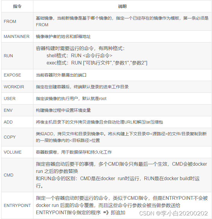 Dockerfile结构的四个部分:基本镜像信息,维护者信息,镜像操作指令和容器启动执行指令