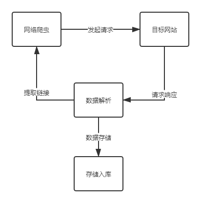 如图1所示,完整的爬虫流程应当是编写的网络爬虫在发起请求之后,目标服务器返回指定的请求响应,通过对请求响应返回的响应体进行解析,找到需要的信息进行数据存储。如果需要翻页或者进行跳转,则从当前页面或者响应体中提取出链接再次发起请求。