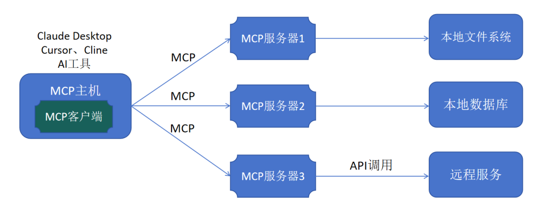 1、MCP主机上的应用程序,通过MCP客户端与一个或多个MCP服务器进行连接。