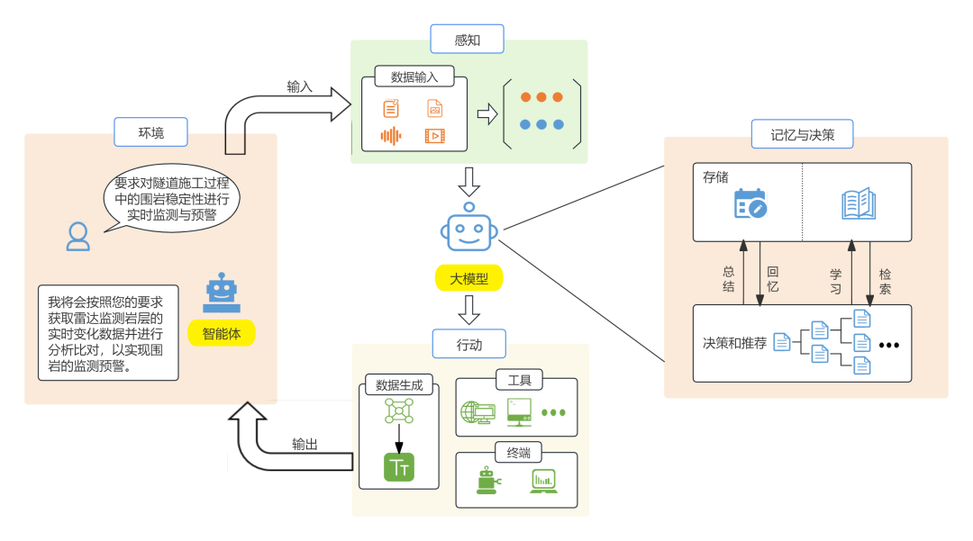 智能体是指能够感知环境、自主决策并执行任务以实现某种目标的实体,例如基于大模型的隧道施工监测智能体:以大语言模型为 “核心大脑”,通过对雷达监测获取岩层变化的数据进行分析,实现围岩稳定性的实时监测预警。