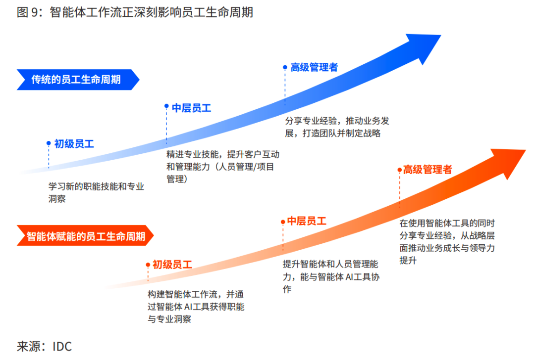 从图中可以看到,人员与智能体协作工作可能会成为未来工作的常态,并且后面如果有经验还可以转化成为管理者。